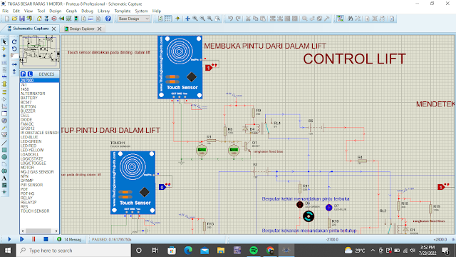 Touch sensor pertama, ketika touch sensor mendeteksi adanya orang yang menekan tombol (dari dalam) sehingga pintu lift tertutup, maka touch sensor akan berlogika 1 . Adanya tegangan keluaran sensor sebesar 5 V, kemudian masuk ke kaki non inverting dan menghasilkan Vout sebesar 5V juga. Ini dapat terjadi karena kita menggunakan rangkaian voltage follower yang dimana Vin=Vout kemudian arus menuju R2. Transistor akan aktif apabila VBEnya >0,7V dapat dilihat disini VBEnya sebesar 0,81V itu menandakan transistor sudah aktif. Selanjutnya arus diteruskan ke kaki base transistor terus ke kaki emitor lalu diteruskan ke ground. Karena arus yang keluar di kaki transistor sudah cukup untuk mengaktifkan transistor sehingga transistor aktif, sehingga arus yang mengalir dari power supply(+12V) akan mengalir ke R13,lalu melewati relay RL5 kemudian ke kaki kolektor, lalu ke kaki emitor dan diteruskan ke ground. Karena adanya arus yang melewati relay maka switch relay berpindah ke kiri, maka ada arus yang mengalir dari baterai menuju ke R11dan LED hijau akan aktif. Lalu, arus menuju motor sehingga mengaktifkan motor dan motor akan berputar ke kanan yang menandakan pintu tertutup, pintu tertutup ditandai dengan aktifnya led berwarna hijau sebagai indicator.
